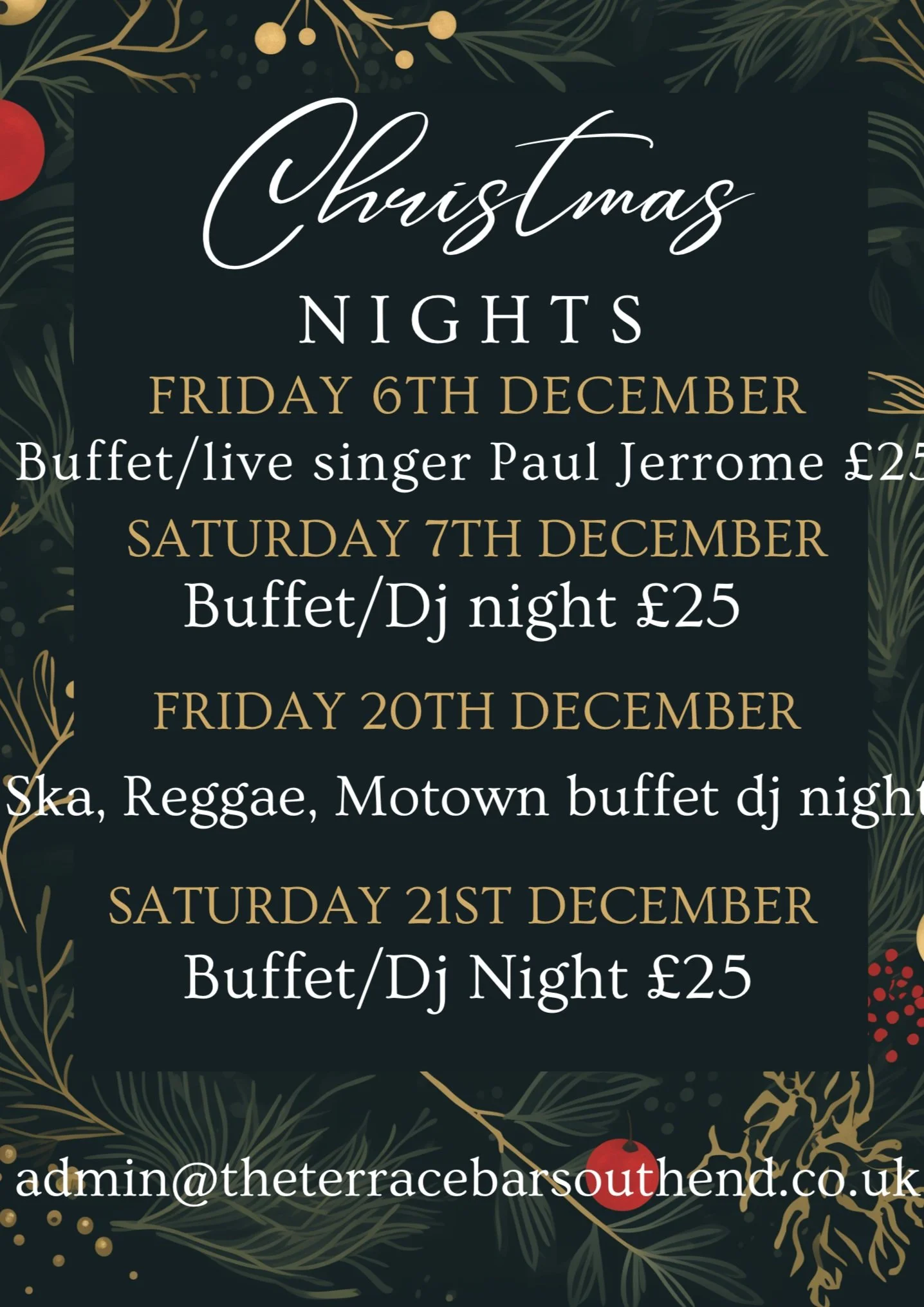 Saturday 21st December Buffet/DJ Night £25pp