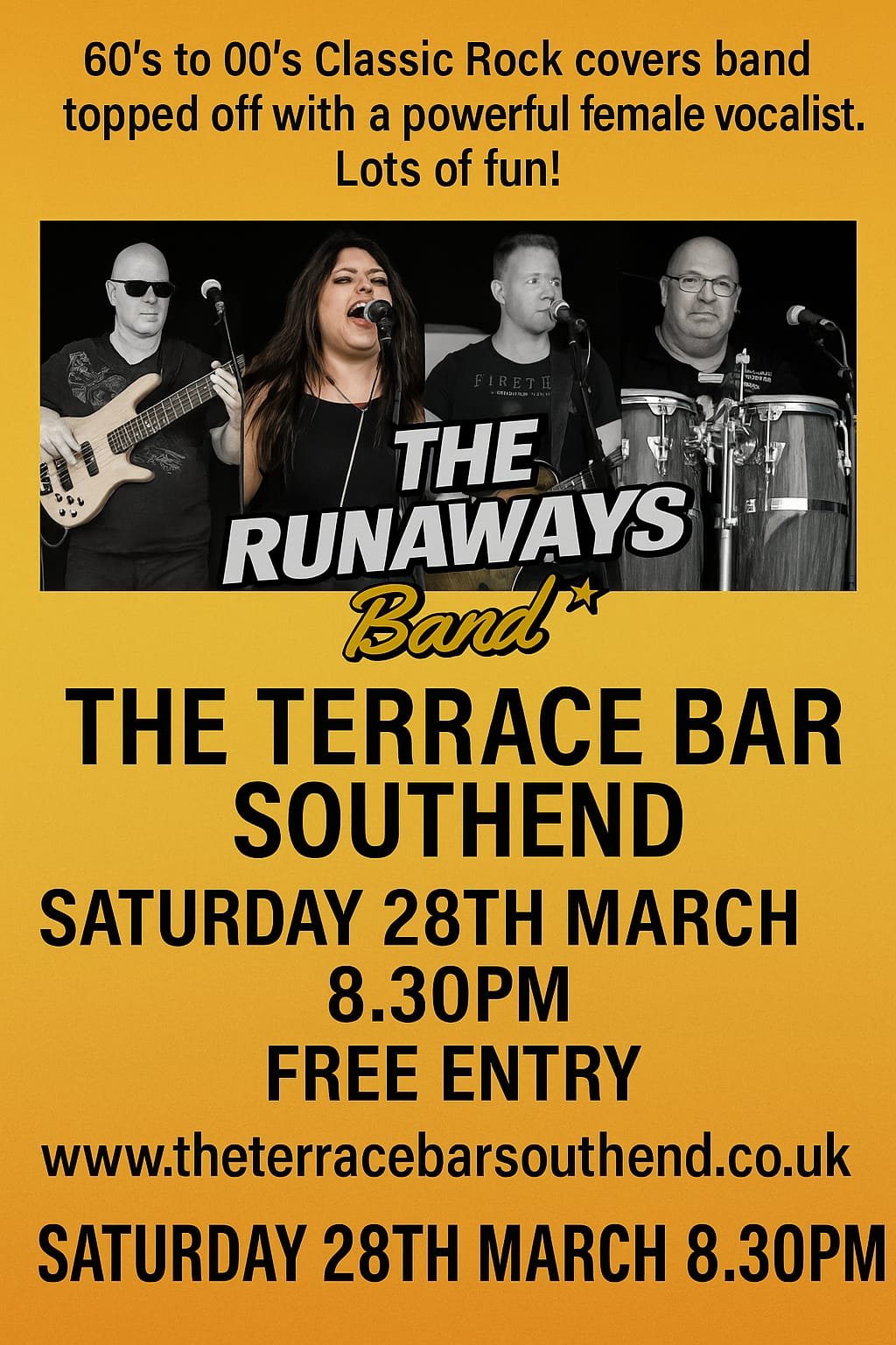 The runaways are a 60s to 00s classic rock covers band with powerful female vocalist and lots of fun.